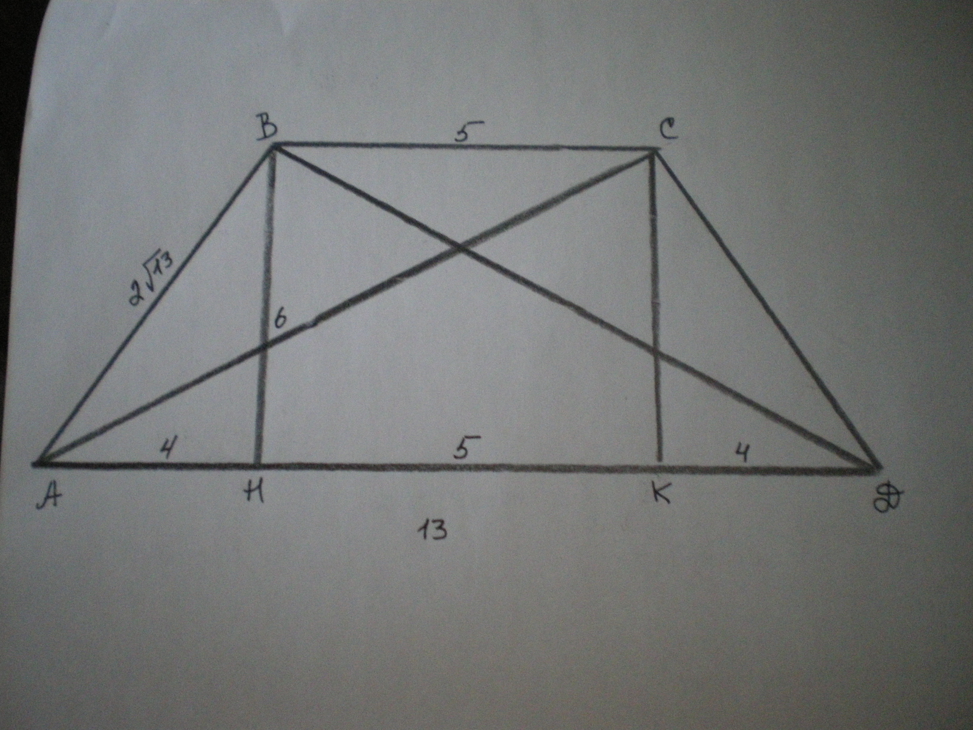 Решение: Проведем высоты ВН и СК. Тогда КН=ВС=5 см, АН=КД=(13-5):2=4 см.