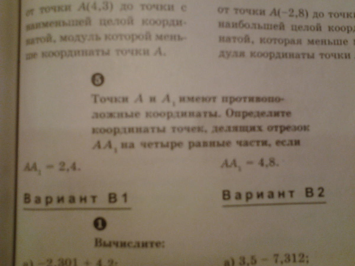 Точки А и А1 имеют противоположные координаты .Определите координаты точек,делящих отрезок АА1 на четыре равные части,если АА1= 2,4. Ответ будет такой -1,2;0;1,2. Пожалуйстаа.