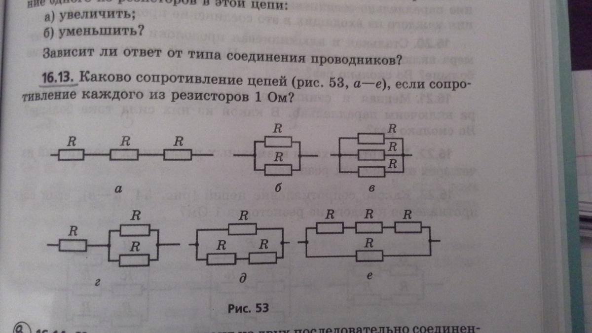 каково сопротивление цепей рис 53 а-е если сопротивление каждого из резисторов 1 ом ?