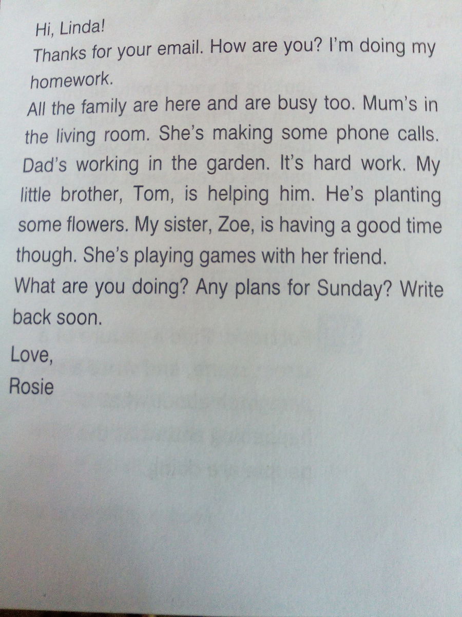 Мама в зале разговаривает по телефону. Папа работает в саду. Эта работа очень трудная. Брат Том помогает папе. Сестра играет со своими друзьями. А чем ты занята? Что ты делаешь в Воскресенье? Напиши скорее.