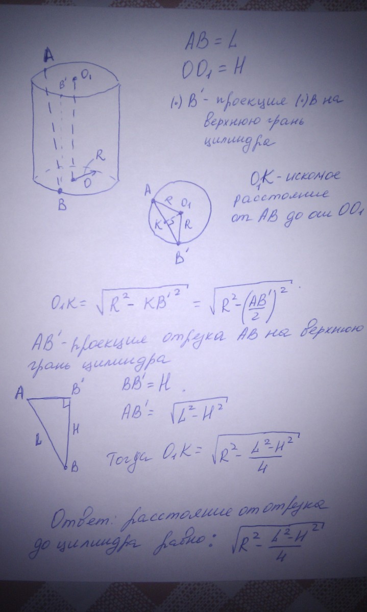 Помогите решить задачу!! Пожалуйста!! Очень надо!!! Заранее спасибо)) Высота цилиндра Н, радиус R. В конце данного отрезка лежат на кругах обоих основ, длинна отрезка L.Найти расстояние от этого отрезка к оси цилиндра.