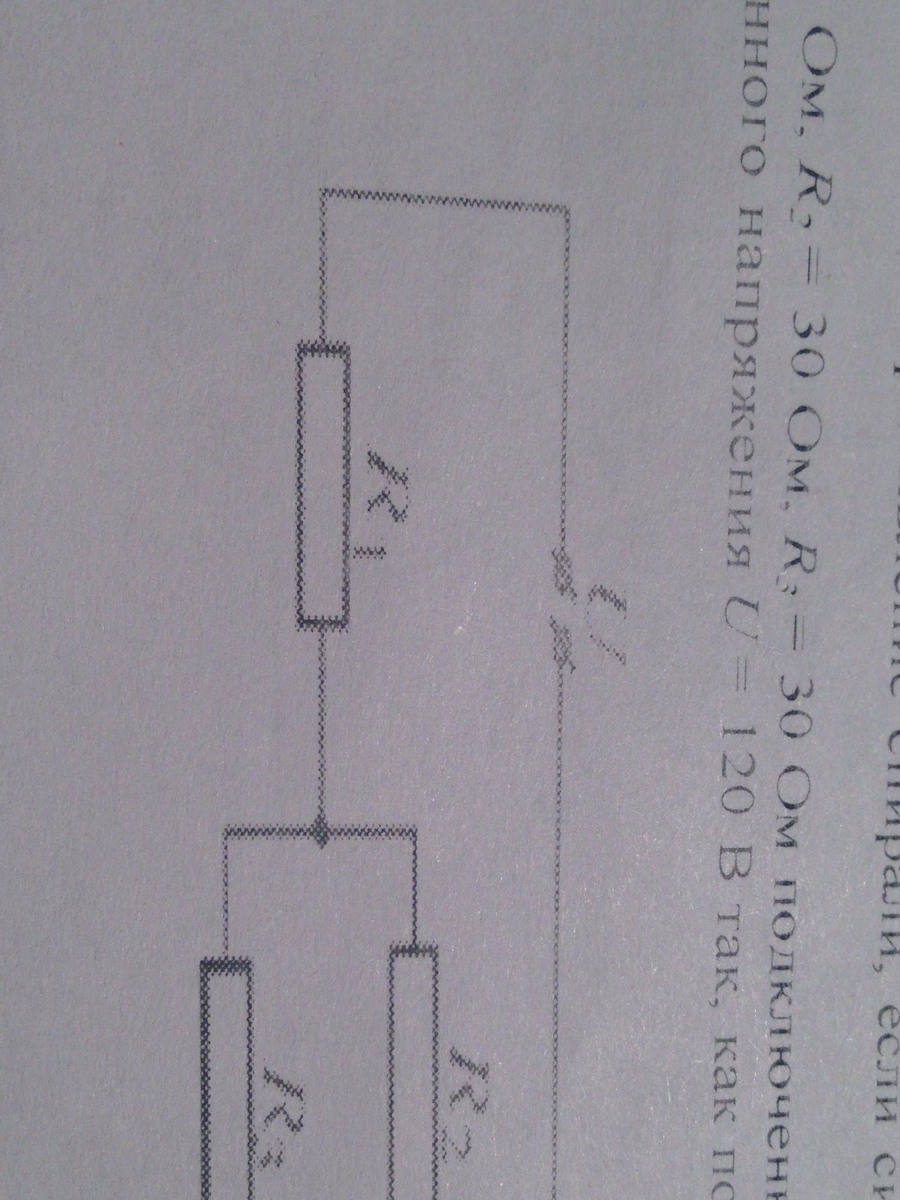 Резисторе r1=25ом, r2=30 Ом, r3=30 Ом подключены к источнику постоянного напряжения u=120в так, как показано на рисунке. Какая мощность выделяется в резисторе r1?