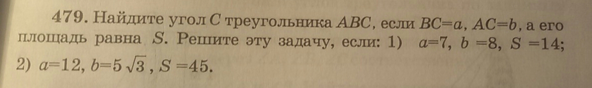 В данном случае угол между сторонами а и b и есть искомый угол С. Выразим его синус из формулы площади, получим, что