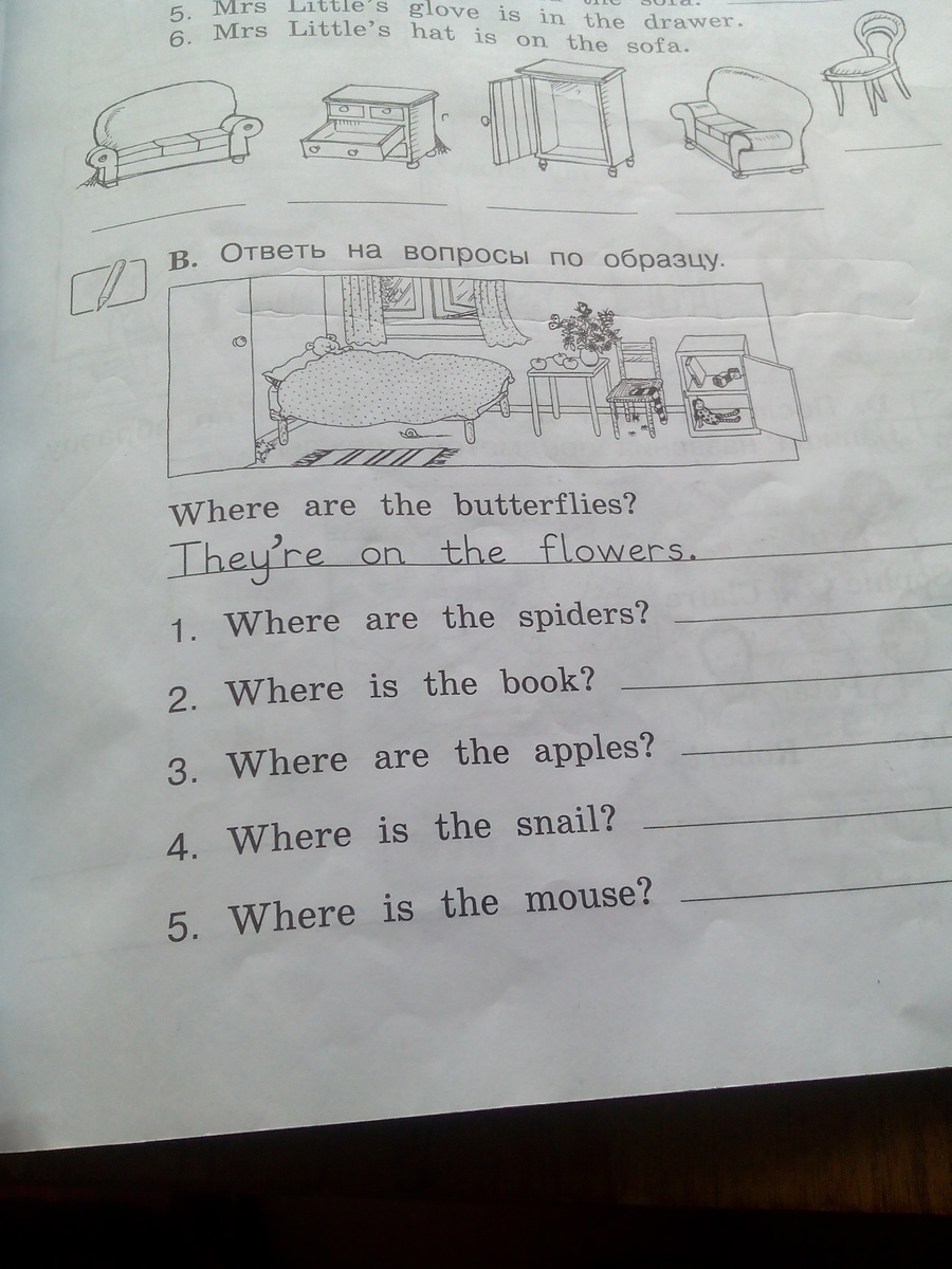 2 It is on the shelf 3 They are on the table 4 It is under the beb 5 it is near the door первое не могу