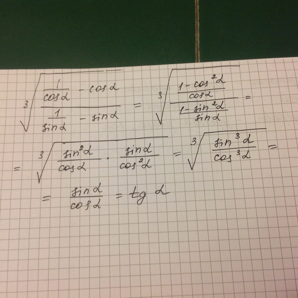 Sin²α/Cosα:Cos²α/Sinα = Sin²α/Cosα*Sinα/Cos²α = Sin³α/Cos³α = tg³α