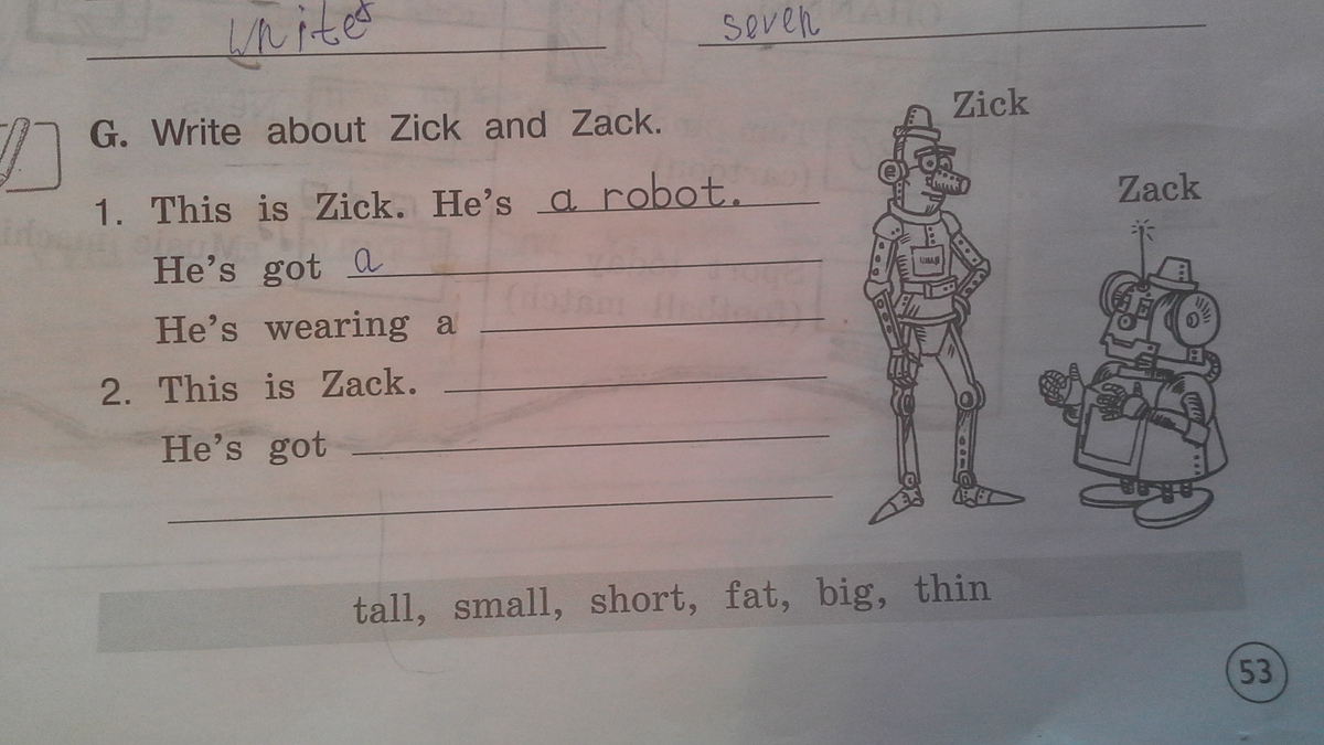 He's got a tall and thin body. He's wearing a small hat. This is Zack. He is short and fat. He's got a big antenna.