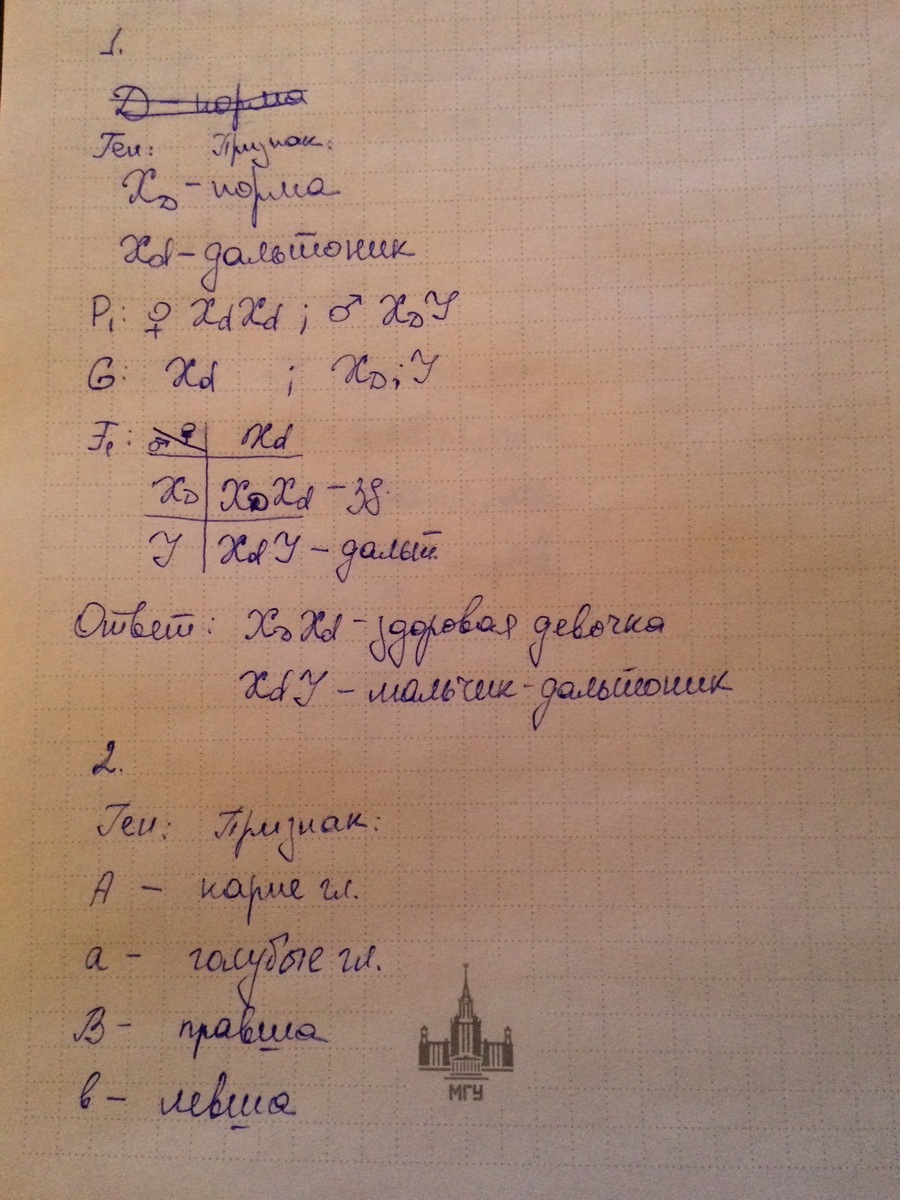 1. У человека цветная слепота(дальтонизм) обусловлена рецессивным геном, сцепленным половой Х хромосомой. Женщина дальтоник вышла замужь за мужчину с нормальным зрением. Определите генотип и фенотип возможных детей.