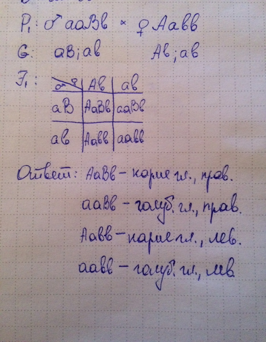 2. Голубоглазый гетерозиготный правша жениться на гетерозиготной кареглазой левше. Известно что праворукость доминирует над леворукостью а карие глаза над голубыми. Определите фенотип и генотип возможного потомства.