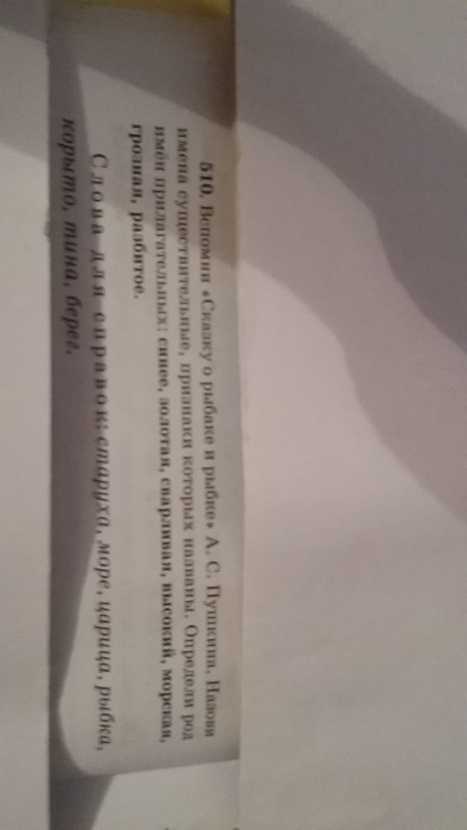 Синее море - мужской род, золотая рыбка - женский, сварливая старуха - женский, высокий берег - мужской, морская тина - женский, грозная царица - женский, разбитое корыто - средний