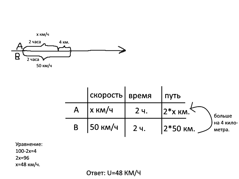 помогите решить задачу две машины везли с поля картофель выехали они в 8 часов утра и поехали в одном напровление В 10 часов расстояния между ними было 4 километра С какой скоростью двигался один из грузовиков, если скорость второго 50 километра в час