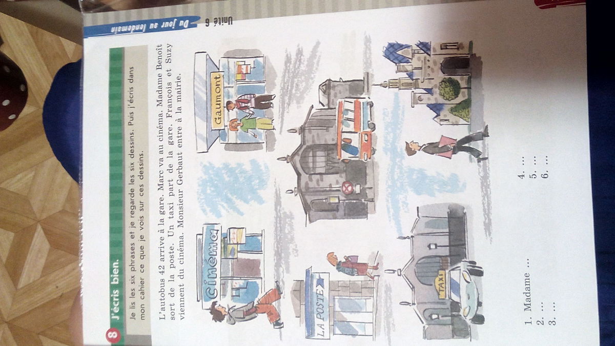 Madame Benoît sort de la poste. L'autobus 42 arrive à la gare.