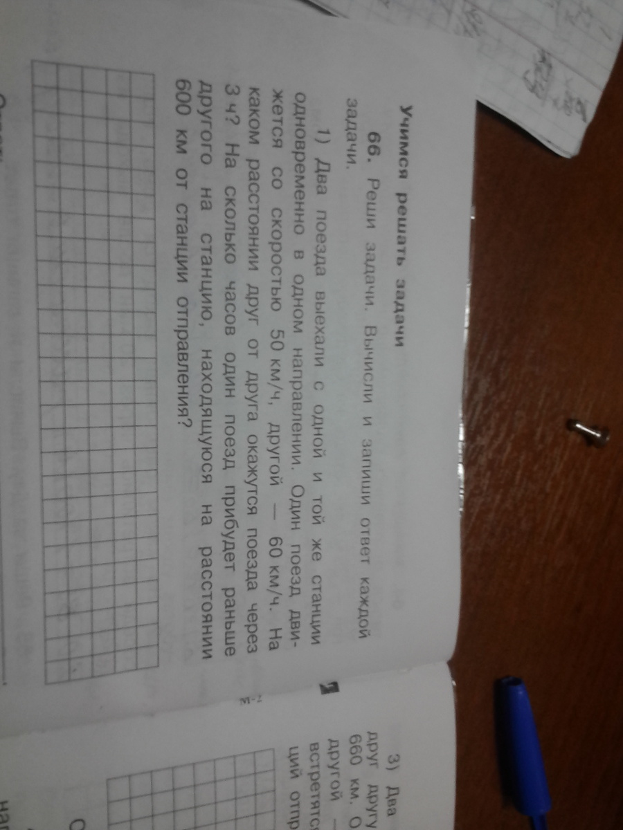 два поезда выехали с одной и той же станции одновременно в одном направлении один поезд движется со скоростью 50 киломотправления? другой 60 километров в час на коком расстоянии друг от друга окажутся поезда через 3 часа?На сколько часов один поезд прибудет раньше другого на станцию находящуюся на расстоянии 600 километров от станции отправления?