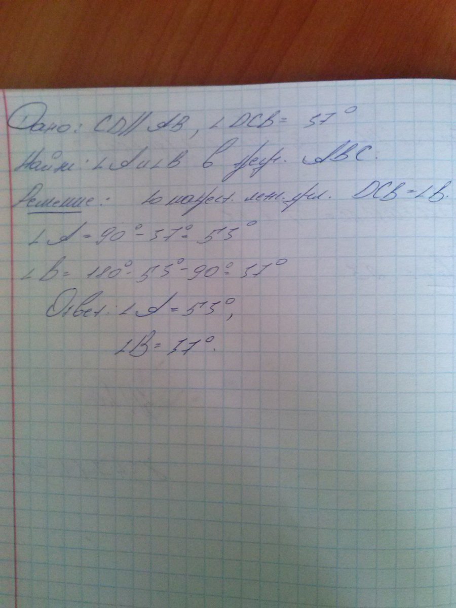 Через вершину прямого угла c,треугольника abc проведена прямая cd паролельна ab угол dcb равен 37 градусов найти угол A и B в треугольнике ABC