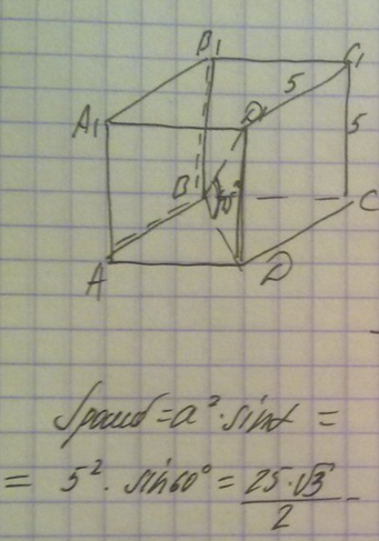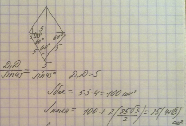Основание прямой призмы — ромб с меньшей диагональю 5 см и углом 120°. Меньшая диагональ призмы образует угол 45° с плоскостью основания. Найдите площадь полной поверхности призмы (Sполн)