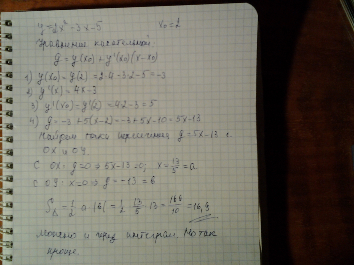 Треугольник образован осями координат и касательной к графику функции y=2x^2-3x-5 в точке x0=2. Площадь этого треугольника...