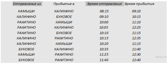 Определите самое раннее время, когда путешественник сможет оказаться в пункте РАКИТИНО согласно этому расписанию.