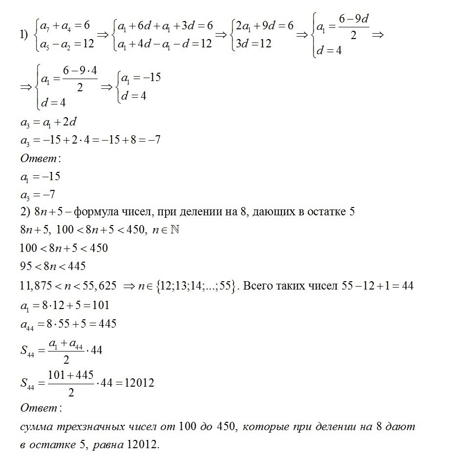 1, Сумма седьмого и четвертого членов арифметической прогрессии равна 6. Пятый ее член на 12 больше второго. Найдите первый и третий члены этой прогрессии. 2. Найдите сумму всех трехзначных чисел от 100 до 450, которые при делении на 8 дают в остатке 5,