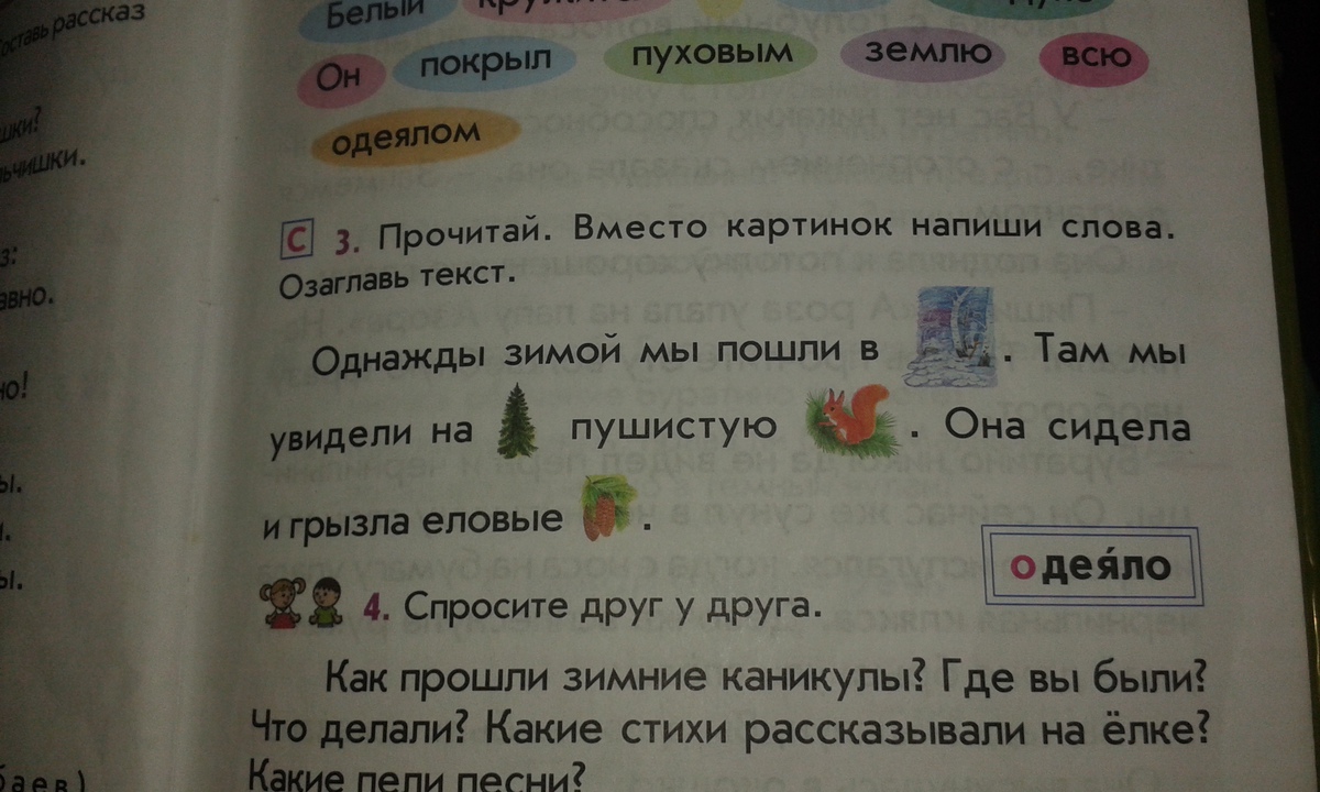 Однажды зимой мы пошли в лес.Там мы увидели на елке пушистую белку. Она сидела и грызла еловые шишки.