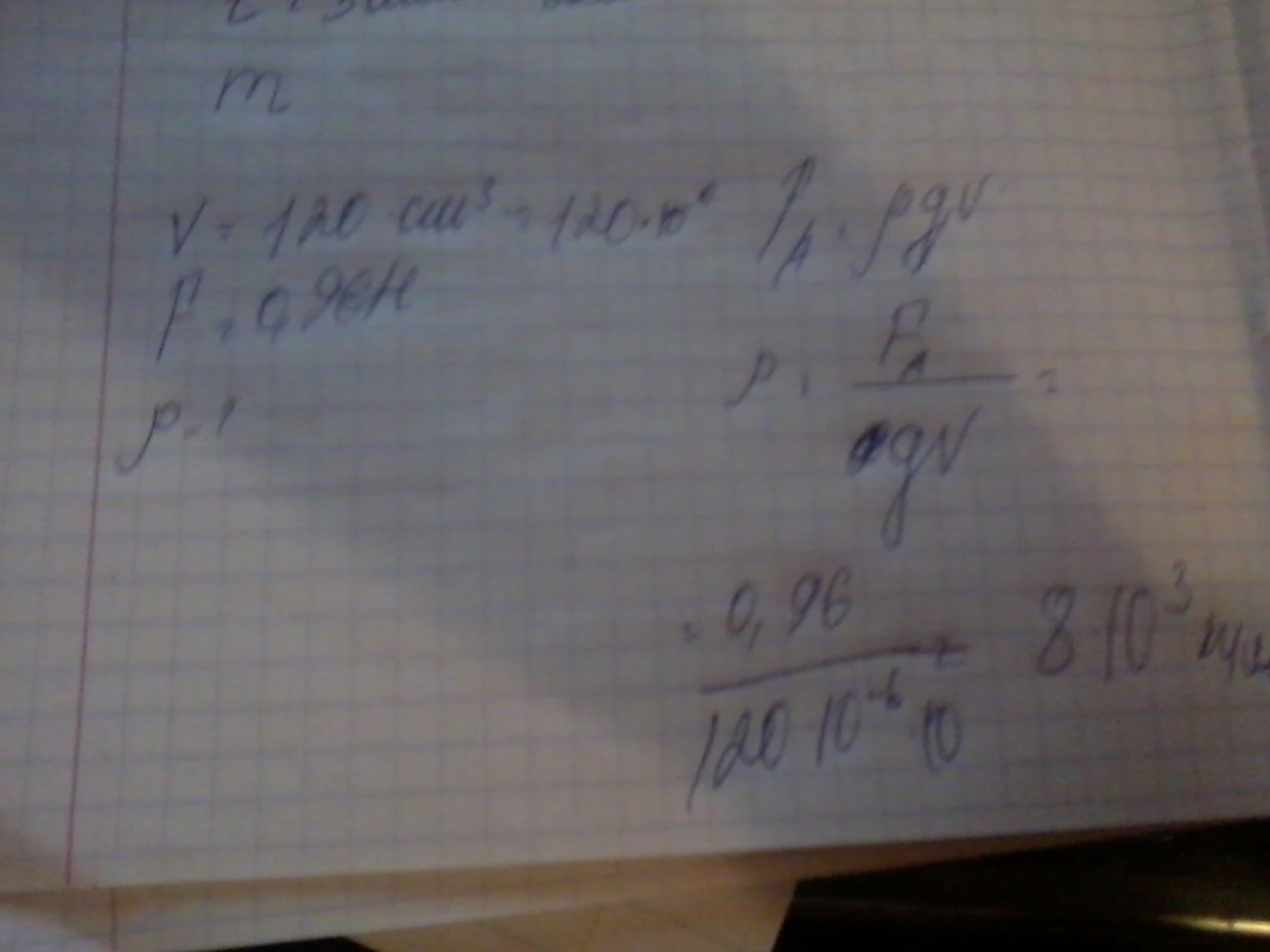 на тело объемом 120 см3 полностью погруженное в жидкость действует архимедова сила 0.96н. какова плотность жидкости?