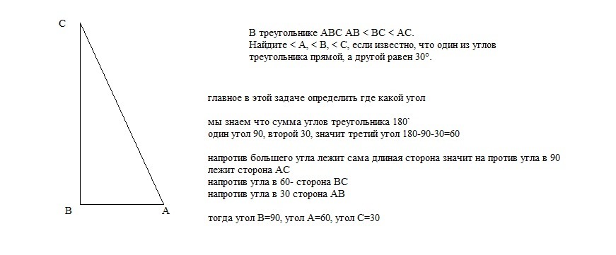 В треугольнике АВС АВ < ВС < АС. Найдите < А, < В, < С, если известно, что один из углов треугольника прямой, а другой равен 30°.