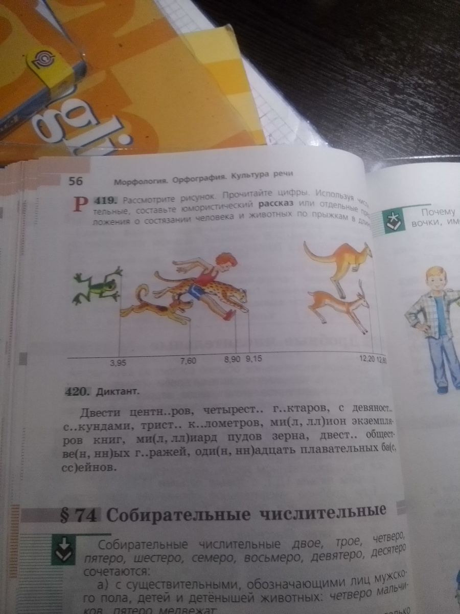 Рассмотрите рисунок. Прочитайте цифры. Используя числительные составьте юмористический рассказ или отдельные предложения о состязании человека и животных по прыжкам в длину