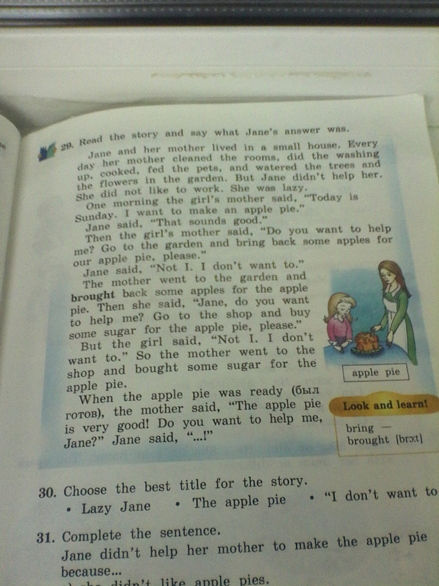 Когда яблочный пирог был готов, мама сказала: "Яблочной пирог очень хорош! Ты хочешь мне помочь, Джейн?" Джейн сказала: "...!"
