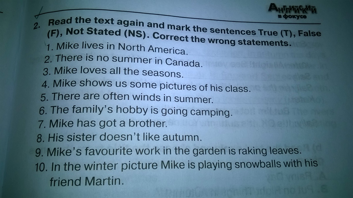 Прочитай текст знову і відміть речення те що правильно Т, те що непправильно f, не було в тексті такого NS