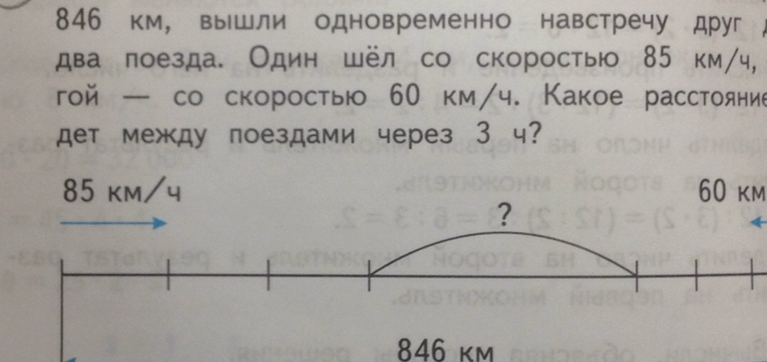 из 2 городов ,расстояние между которыми 846 км вышли одновременно навстречу друг другу два поезда .Один шёл со скоростью 85 км /ч другой со скоростью 60 км/ч .Какое расстояние будет между поездами через 3 ч?