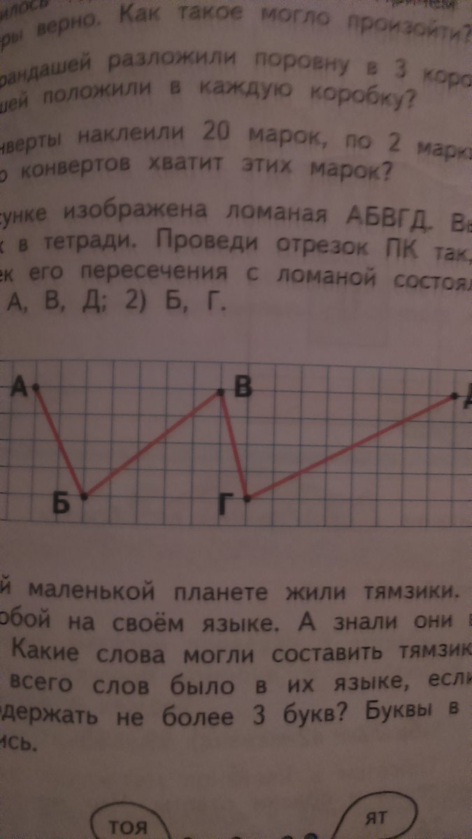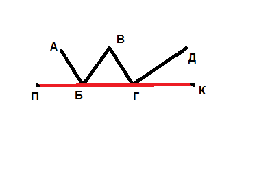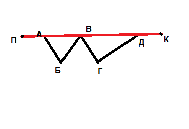 на рисунке изображена ломаная АБВГД. Выполни такой же рисунок в тетради. Проведи отрезок ПК так, чтобы множество точек его пересечения с ломаной состояло только из точек 1) А,В,Д; 2) Б, Г.