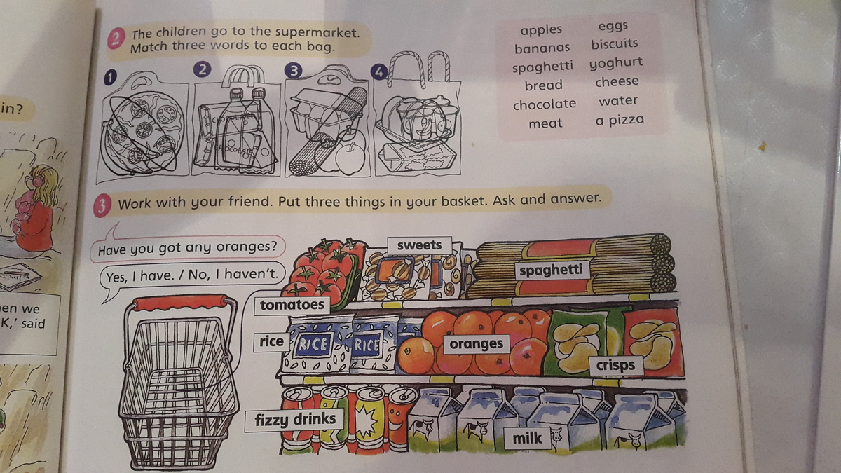 Эплз, бананас, спагети,брэд, чоколэт, мит, эгс, бисквуитс, йогурт, чиз,уовотэр, э пицца. Хэв ю гот эни орэнджс? Ес ай хэв\ноу ай хэвнт. Свитс, спагети, тоатос, райс, орэнджс, криспс, файзи дринкс, милк.