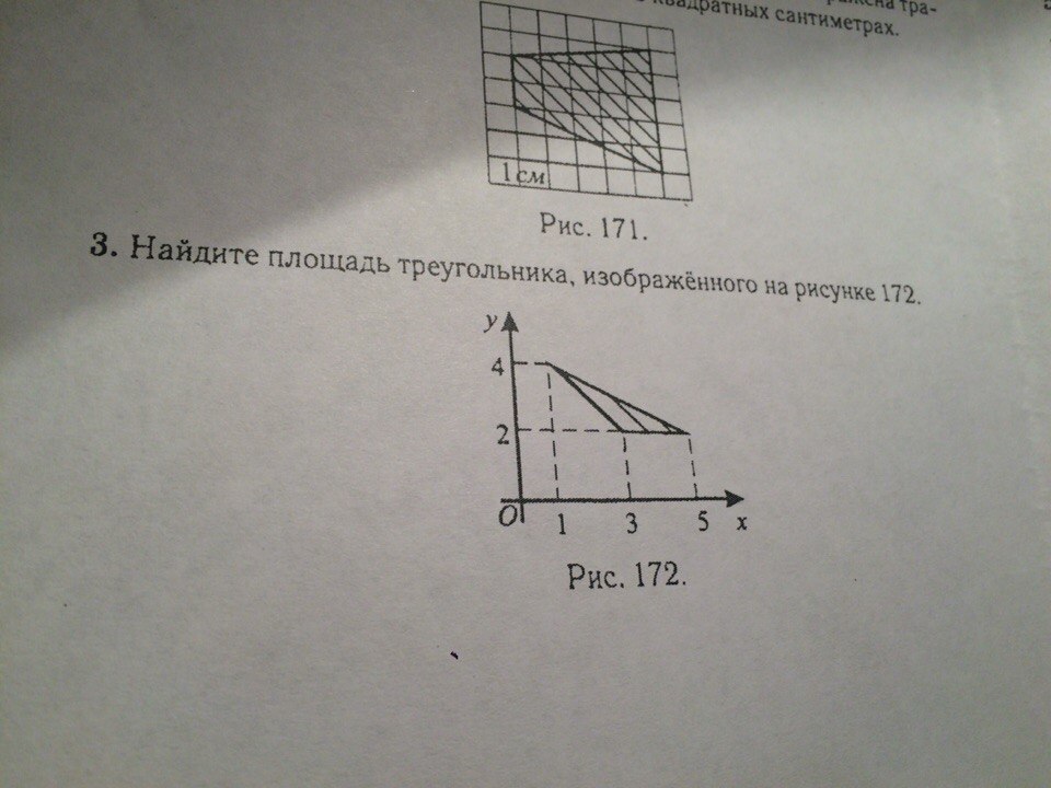Как я всегда делаю-достраиваю любую фигуру,площадь которой находится не на "раз-два" до какой-нибудь фигуры (с прямыми углами,важно), площадь которой находится намного легче и затем вычитаю "ненужные" площади прямоугольных треугольников. Как и здесь, мысленно достраиваем до прямоугольника со сторонами 2 и 4, площадь которого будет равна 8 кв см. Находим площади окружающих искомую фигуру треугольников. 1 треугольник с основанием 2 и высотой 2 (левый нижний угол),площадь которого равна 1/2*2*2=2кв см. Второй треугольник с основанием 4 и высотой 2 (правый верхний угол) S=1/2*4*2=4 кв см. Ищем площадь искомой фигуры, вычитая из общей все найденные : 8-(2+4)=2 кв см