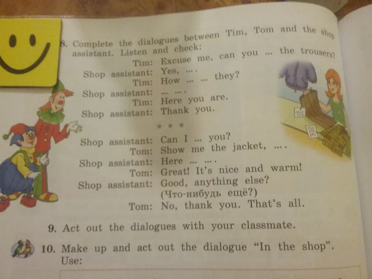 Помогите с английским ,я егомвообще не понимаю и за каждой домашкой к вам обращаюсь.Помогите люди добрые .Там надо вставить слова или что-то ещё в предложения и перевод сделать ,помогите со вторым диалогом желательно с переводом ,пожалуйста.