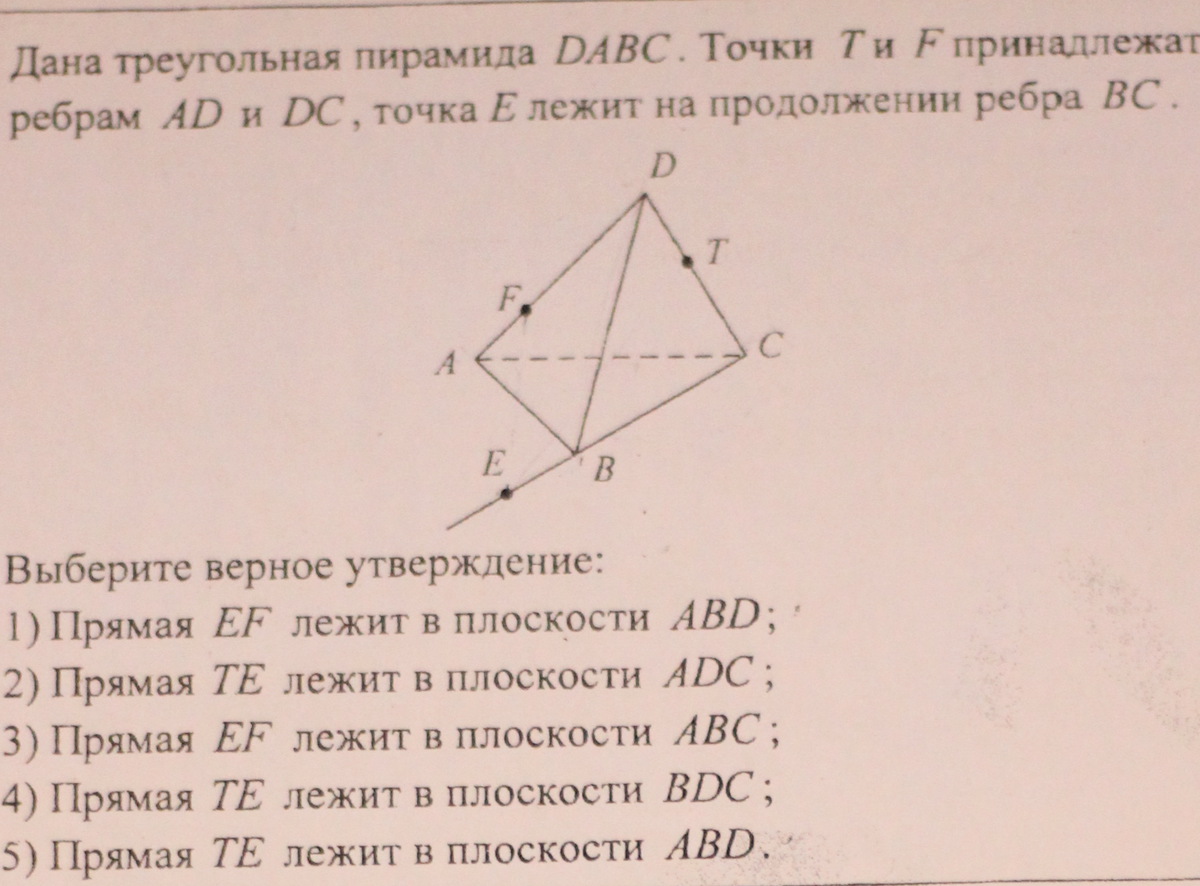 Дана треугольная пирамида DABC. Точки T и Fпринадлежат ребрам AD и DC, точка Е лежит на продолжении ребра BC.