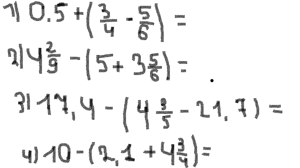 Сначала считаешь в скобках.Переводишь обычные дроби в десятичные и делаешь там вычисление.А потом уже складываешь или вычисляешь вне скобок и все!