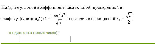f'(x)=(frac{cos4x^2}{sqrtpi})'=frac{-sin4x^2cdot(4x^2)'}{sqrtpi}=frac{-8xsin4x^2}{sqrtpi}\f'(x_0)=frac{-8x_0sin4x_0^2}{sqrtpi}=-frac{8sqrtpisinpi}{2sqrtpi}=0