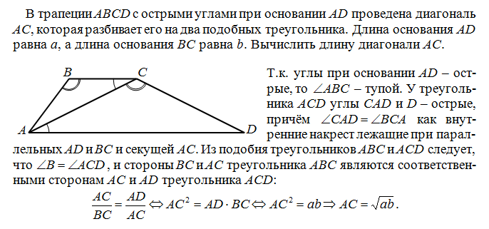 В трапеции ABCD с острыми углами при основании AD проведена диагональ AC, которая разбивает его на два подобных треугольника. Длина основания AD равна a, а длина основания BC равна b. Вычислить длину диагонали AC.