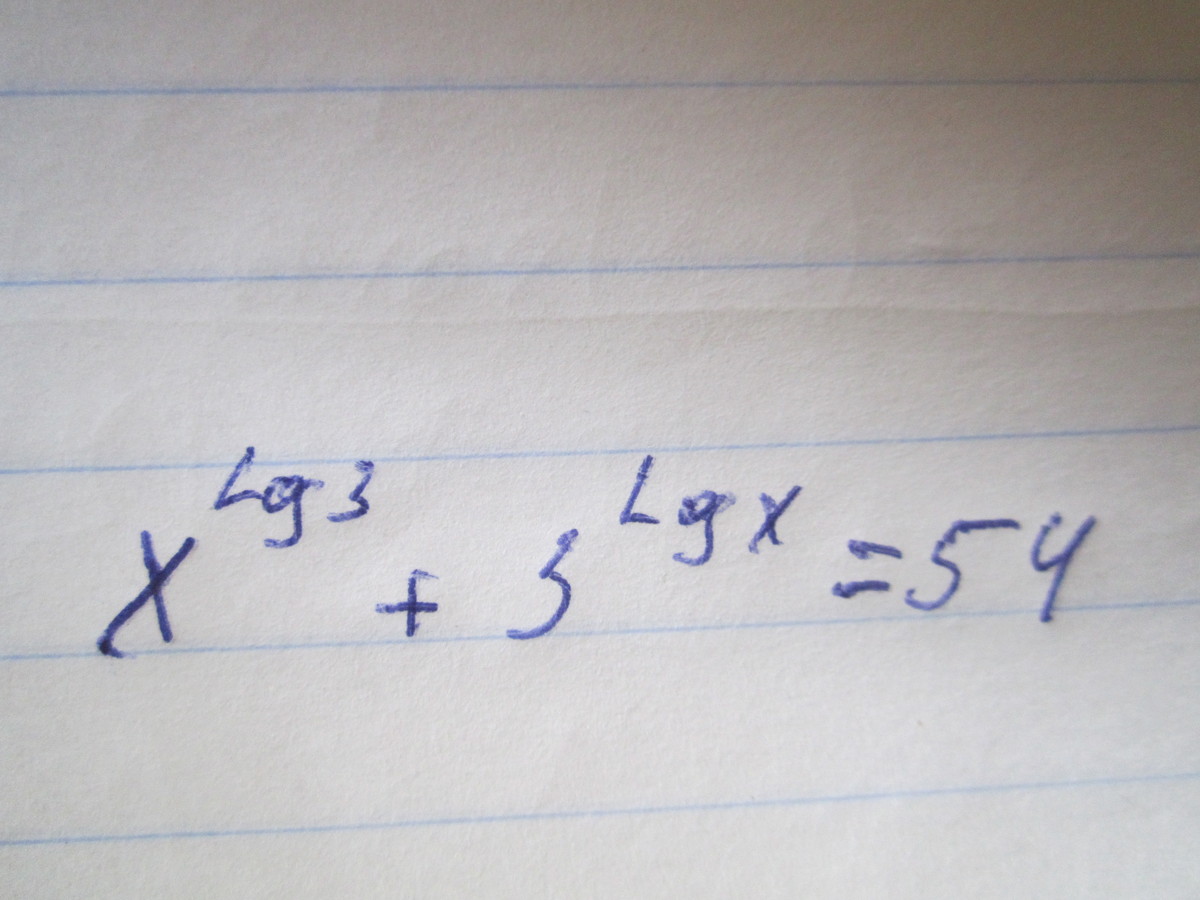 x^{lg3}+3^{lgx}=54\ 3^{lgx}+3^{lgx}=54\ 2*3^{lgx}=54\ 3^{lgx}=27\ 3^{lgx}=3^3\ lgx=3\x=100