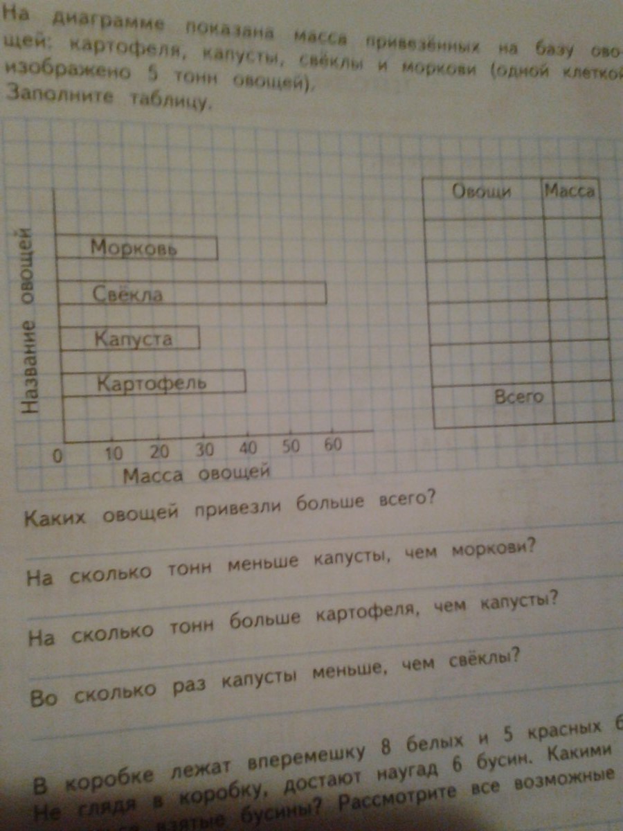 На диаграмме показана масса привезенных на базу овощей: картофеля, капусты, свеклы и моркови (одной клеткой изображено 5 тонн овощей).