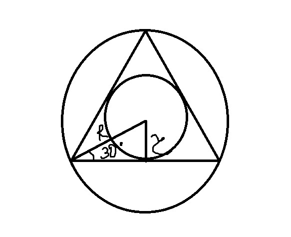 В правильном треугольнике радиус описанной окружности в 2 раза больше радиуса вписанной окружности. R =2r.