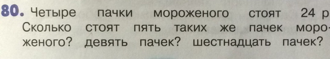 Четыре пачки мороженого стоят 24 р Сколько стоят пять таких же пачек мором жженого девять пачек шестнадцать пачек