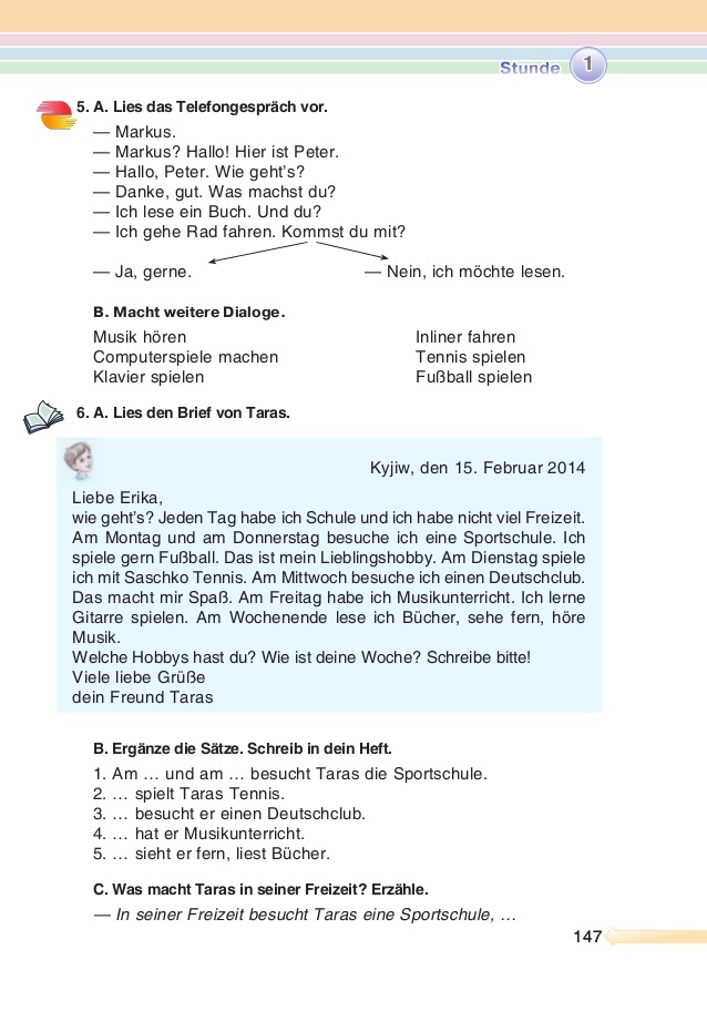 Дорогая Эрика, как твои дела? Каждый день я в школе и я не имею свободного времени. В понедельник и четверг я посещаю спортивную школу. Я охотно играю в футбол. Это моё любимое хобби. Во вторник я играю с Сашко в теннис. В среду посещая немецкий клуб. Это доставляет мне удовольствие ( или можно перевести как "Я получаю от этого удовольствие") В пятницы у меня урок музыки. Я учусь играть на гитаре. На выходных я читаю книги, смотрю телевизор, слушаю музыку.
