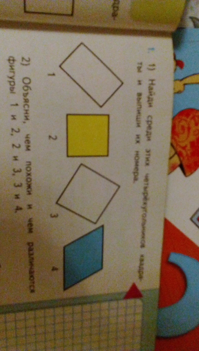 2)они различаются тем что в 1-ом прямоугольник во 2-ом квадрат, во 2 и 3-им то что в-ом квадрат в 3-тим квадрат только перевёрнутый,3-им и 4-ом то что в 3-им квадрат а в 4-ом четырёхугольник