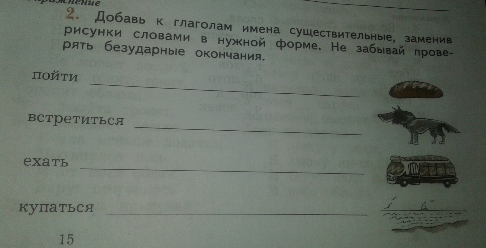 Добавь к глаголом имена существительные,заменив рисунки словами в нужной форме .не забывай проверять безударные оканчания .пойти-хлеб.встретиться-волк. ехать-автобус .купаться-море.