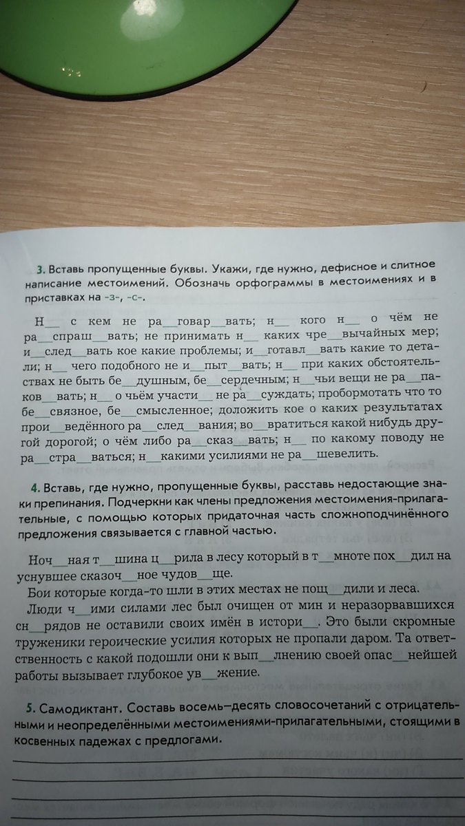 Вставь пропущенные буквы. Укажи, где нужно, дефисное и слитное написание местоимений. Обозначь орфограммы в местоимениях и в приставках на -з-,-с-