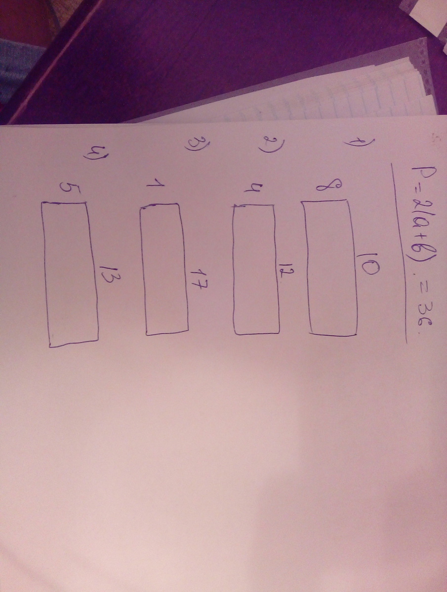 начертить четыре прямоугольника, длины сторон у которых различаются,а периметры равны 36 клеткам