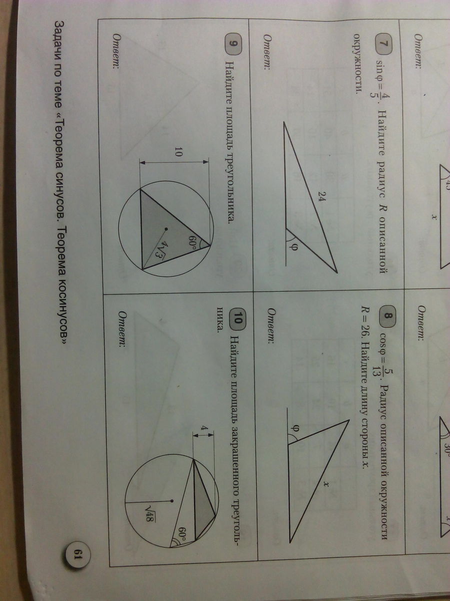 = 2R, т.е. отношение стороны к синусу угла, напротив которого лежит эта сторона, численно равно диаметру описанной окружности. У нас есть радиус описанной окружности 4