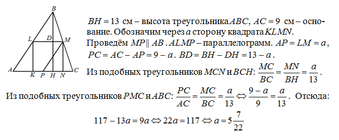 В треугольник с основанием AC=9 см и высотой BD=13 см вписан квадрат KLMN так, что сторона KN лежит на основании AC, а вершины L и M — соответственно на сторонах AB и BC. Определи длину стороны квадрата.