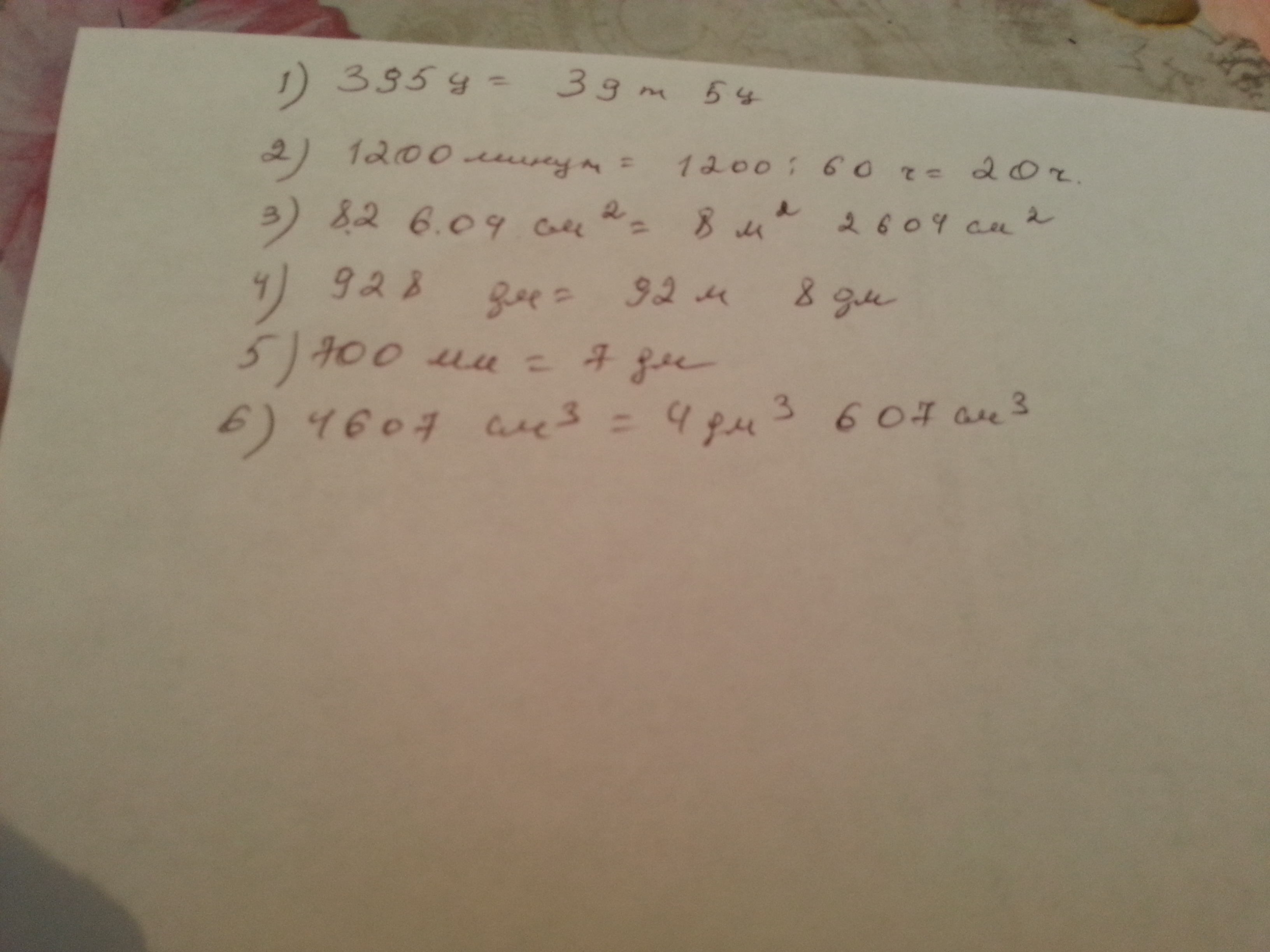Запиши числа, используя более крупные единицы измерения величин: 395 центнеров, 1200 минут, 82604 см2, 928 дм, 700 мм, 4607 см3.