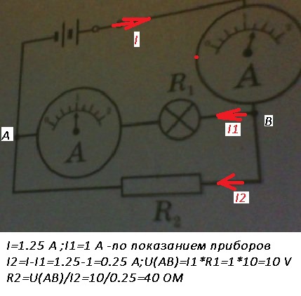 сопротивление лампы R1= 10 Ом . Найдите сопротивление проводников R2.Какую силу тока покажет амперметр A