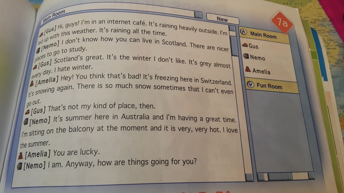 -Привет,ребята! Я в интернет кафе. На улице идет сильный дождь.Мне надоела эта погода.Идет дождь целый день.